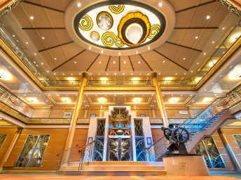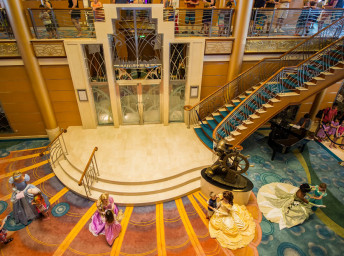 - Magic 's Atrium (centrální část lodi, přes 3 paluby, s bronzovou sochou "Helmsman Mickey")