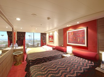 Kajuta s balkónem: 17-23 m², kajuta s manželskou postelí (na požádání 2 oddělené postele) a rozkládací pohovka. Klimatizace, koupelna se sprchou nebo vanou a WC, toaletní stolek, prostorná skříň, interaktivní TV, telefon, minibar, sejf, vysoušeč vlasů. Balkony se stolkem a židlemi.