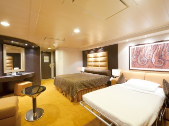 Kajuty jsou vaším soukromým zázemím na lodi. Jsou prakticky vybavené a skýtají dostatek pohodlí. K dispozici je 24 hodinový kajutový servis. Na lodi je 43 kajut různých kategorií pro vozíčkáře.
