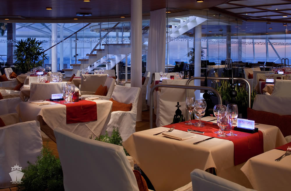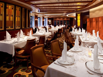 CHOPS GRILLE - klasický americký steakhouse s ručně krájenými steaky v typické restauraci Royal Caribbean s prvotřídním hovězím masem k němuž se přidává mainský humr, grilované branzino a další šťavnatá jídla v kombinaci s návykovými přílohami a neodolatelnými dezerty.