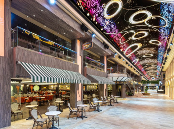 - promenáda s restauracemi, bary a duty-free obchody, zastřešená 480 m² LED "digitální oblohou" s vizuálními show
