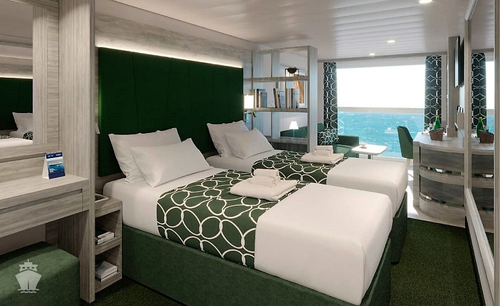 Kajuta oknem: 12 - 20 m², kajuta s manželskou postelí (na požádání 2 oddělené postele) a 1-2 vyklápěcí horní lůžka. Klimatizace, koupelna se sprchou a WC, toaletní stolek, skříň, interaktivní TV, sejf, telefon, vysoušeč vlasů, neotevíratelné okno. Kajuty v kategorii Bella a některé Junior a Deluxe mají omezený výhled.