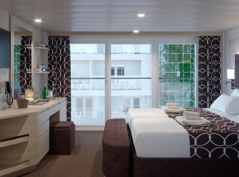 Kajuta s balkónem: 16 - 17 m², kajuta s manželskou postelí (na požádání 2 oddělené postele) a rozkládací pohovka. Klimatizace, koupelna se sprchou nebo vanou a WC, toaletní stolek, prostorná skříň, interaktivní TV, telefon, sejf, vysoušeč vlasů, virtuální asistentka ZOE. Balkony se stolkem a židlemi. Některé kajuty mají omezený výhled; kajuty PR1, PR2, PR3, PV mají výhled na promenádu.