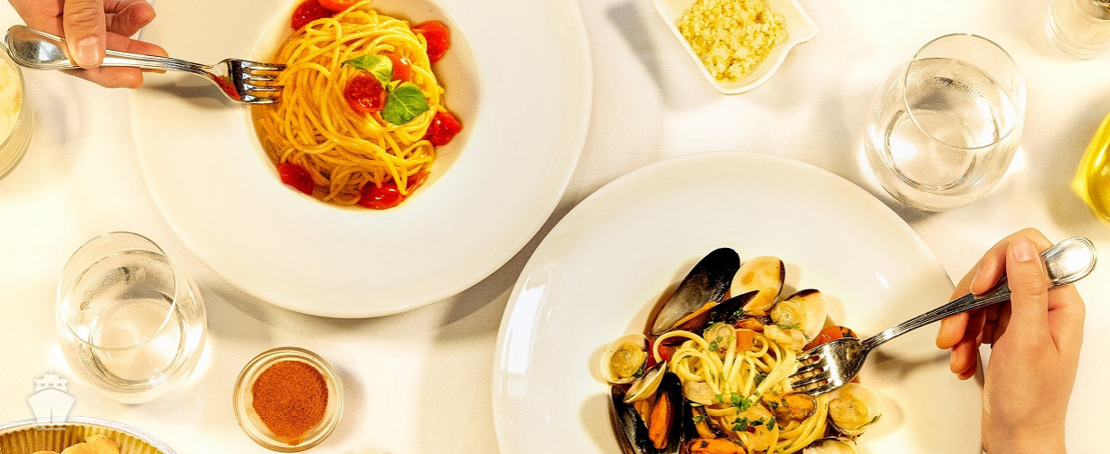 V cena plavby je bohatá plná penze sestávající ze snídaně, oběda, odpolední svačiny a večeře. Podává se evropská i světová kuchyně obohacená o italské regionální speciality: těstoviny na rozmanitý způsob, ryby, mořské plody, pizza, tiramisu a podobně. Některá večerní menu v hlavních restauracích jsou připravována ve spolupráci se světoznámým italským šéfkuchařem Brunem Barbierim (7* Michellin během své dosavadní kariéry).