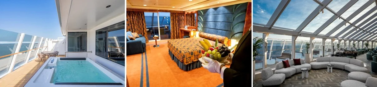 - Prémiové ubytování v apartmá - od Yacht Club Deluxe Suite až po Royal či Owner’s Suite (luxusní matrace, výběr polštářů, vysokokvalitní prádlo, vlastní terasa či balkón)