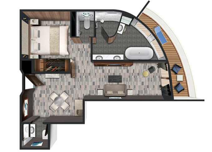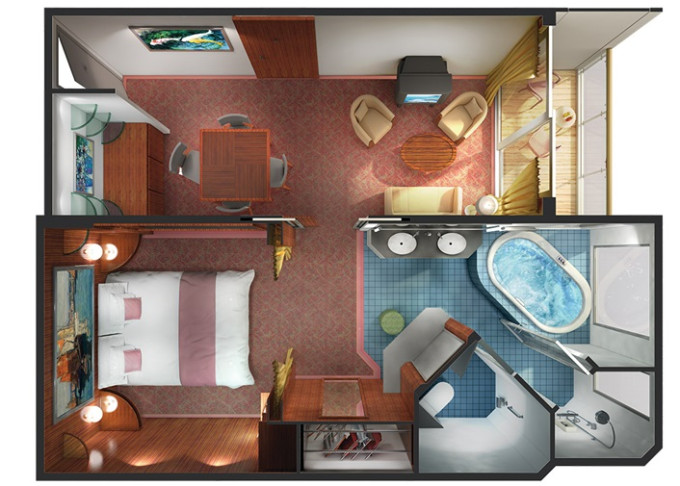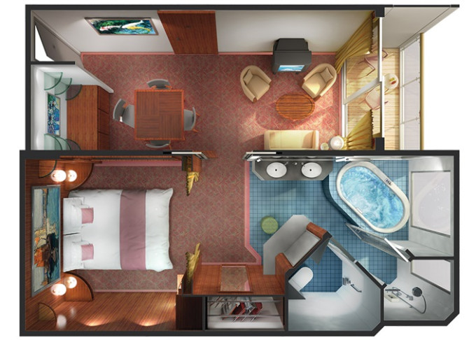 | SB - Aft-facing Owners Suite 56 m² / balkon 7 m². Vířivka. Výhody Suite. 9. paluba - vzadu. Max 2 osoby. | 698 421 Kč 349 210 Kč za osobu |