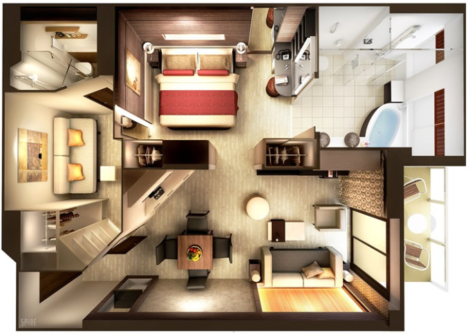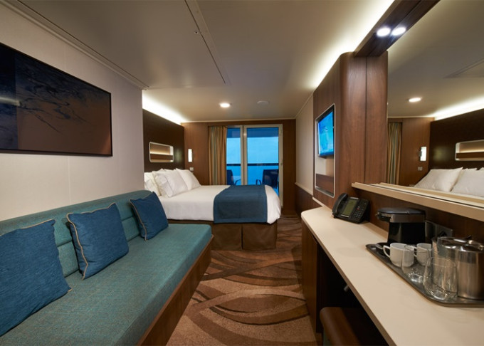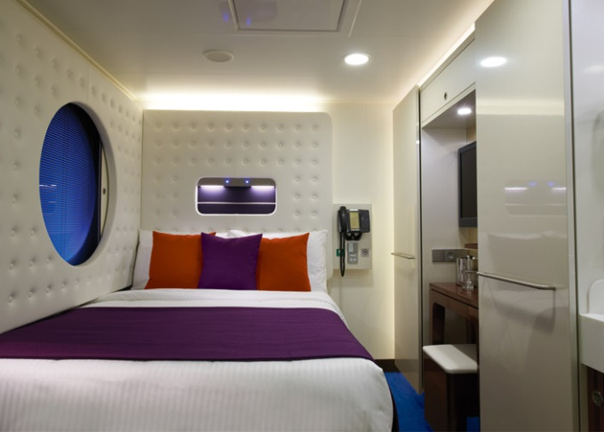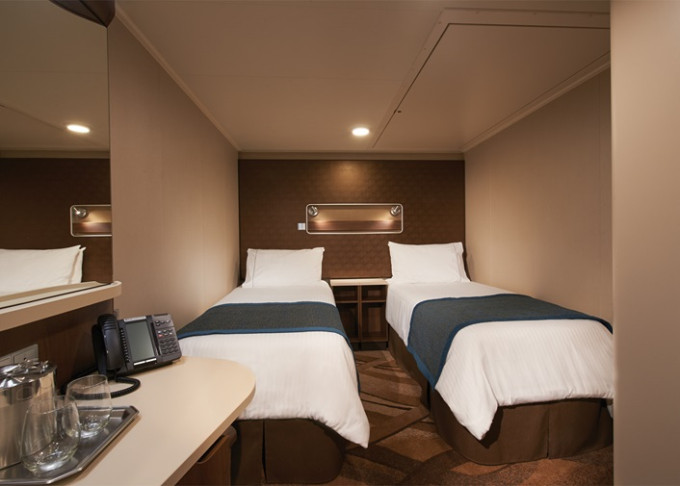 koupelna se sprchou a WC, 2 lůžka, v některých kajutách možnost přistýlek, toaletní stolek, úložné prostory, interaktivní TV, sejf, telefon, vysoušeč vlasů.
