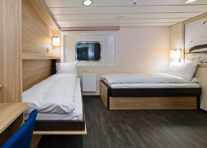| QJ - Vnější kajuta Arctic Superior 17-22 m². Neotevíratelné okno s omezeným výhledem. varná konvice. Max 2 osoby. | 100 909 Kč 50 455 Kč za osobu | ||