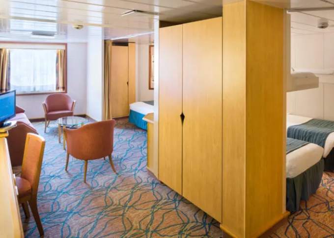 | VO - Ocean View Suite (bez balkonu) 44 m². Panoramatické neotevíratelné okna. Výhody Royal Suite Class. 8. paluba. Max 6 osob. | 241 682 Kč 60 421 Kč za osobu |