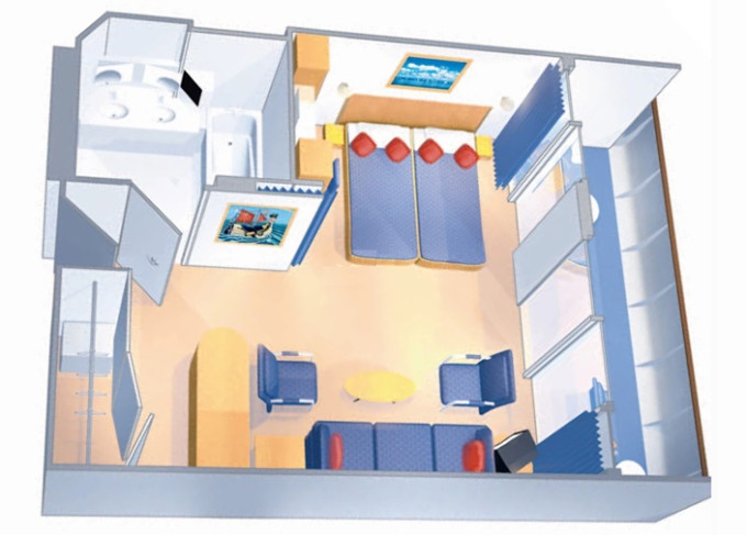 | 4U - Vnitřní kajuta s virtuálním balkonem 14 m². Obrazovka velikosti balkonových dveří s promítaným výhledem. 10. paluba. Max 2 osoby. | 49 855 Kč 24 928 Kč za osobu | ||