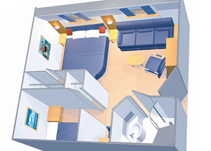 | 1K - Velká vnější kajuta Ultra Spacious 24 m². Neotevíratelné okno. 6. až 9. paluba. Max 6 osob. | 52 053 Kč 52 053 Kč za osobu |