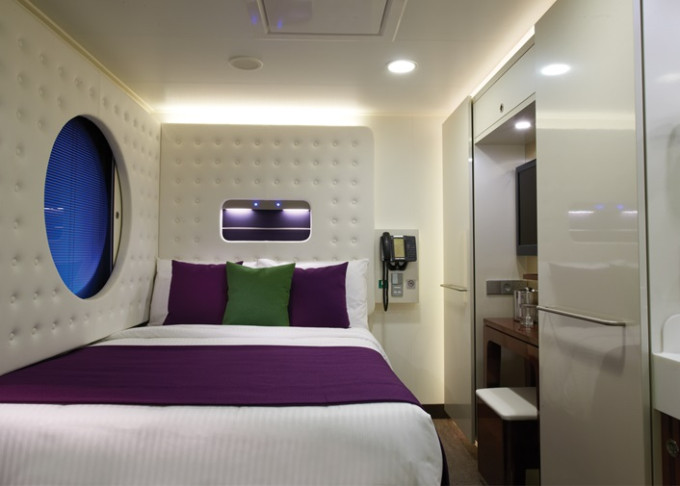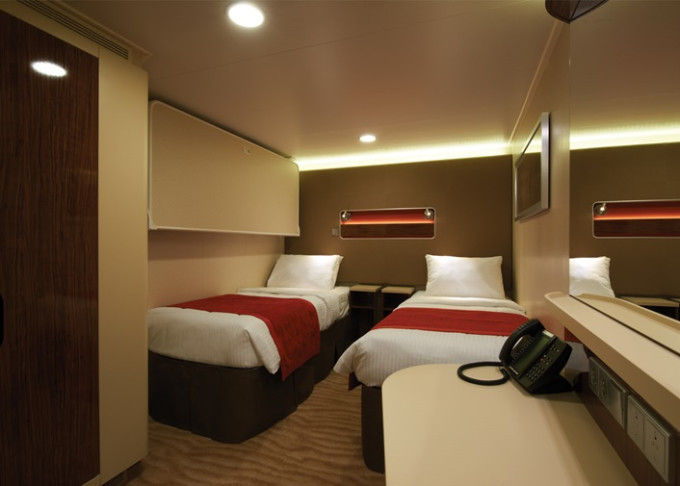 koupelna se sprchou a WC, 2 lůžka, v některých kajutách možnost přistýlek, toaletní stolek, úložné prostory, interaktivní TV, sejf, telefon, vysoušeč vlasů.