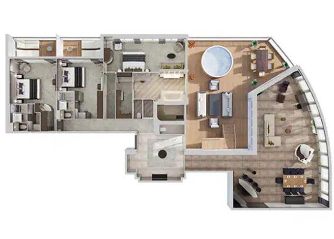 Suite: luxusní varianta ubytování na nejlepších místech na lodi, prostorné a luxusně vybavené; více variant včetně suite v privátní zóně The Haven