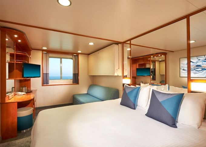 OK - Vnější kajuta / omezený výhled 13-16 m². Neotevíratelné obló s omezeným výhledem. 6. paluba - vpředu. Max 3-4 osoby. 115 346 Kč 57 673 Kč za osobu