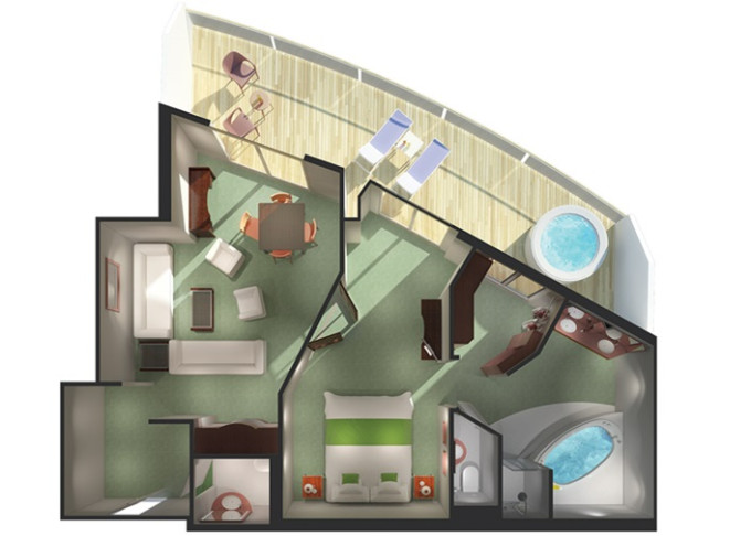 SG - Forward-facing Penthouse 47 m² / balkon 14 m². Vířivka. Výhody Suite. 8. paluba - vpředu. Max 4 osoby. 400 090 Kč 200 045 Kč za osobu