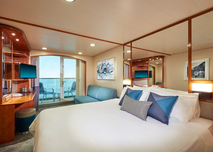 M1 - Club Suite Aft-facing 31 m² / balkon 6 m². Výhody Club. 10. paluba - vzadu. Max 4 osoby. 261 464 Kč 130 732 Kč za osobu
