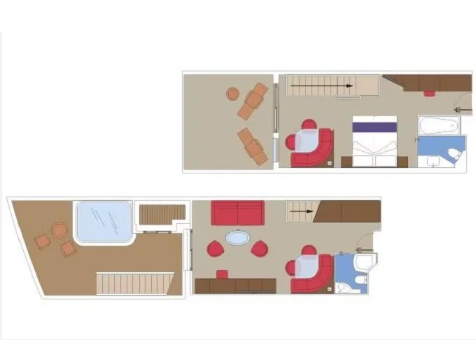 | YJD - Yacht Club Duplex Suite s vířivkou 46 m² + balkon 30 m². Vířivka. 2 podlaží, šatník, 2 koupelny (1 s vanou). Max 4 osoby. 16. paluba. Cenový model MSC Yacht Club. | 118 293 Kč 118 293 Kč za osobu |