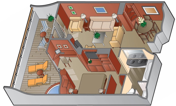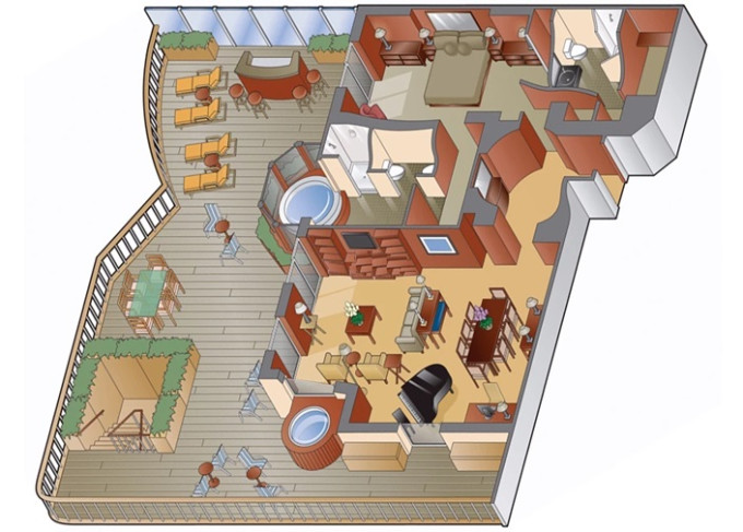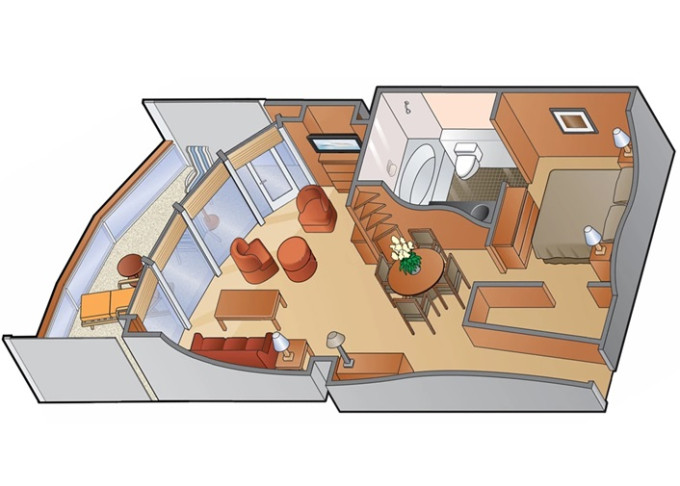 | RS - Royal Suite 50 m² + balkon s vířivkou 18 m² . Koupelna s vířivkou. 6. paluba. Max 4 osoby. Výhody Suite. | 237 536 Kč 118 768 Kč za osobu | ||