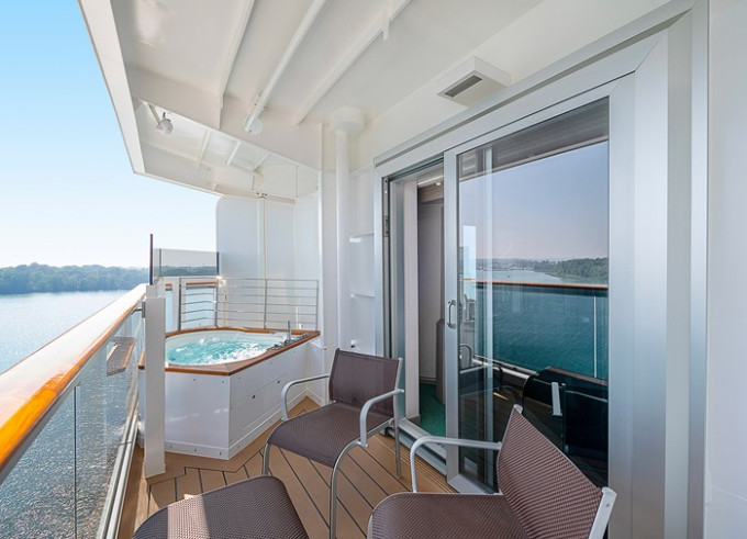 Kajuta s balkónem: 16 -17 m², kajuta s manželskou postelí (na požádání 2 oddělené postele) a rozkládací pohovka. Klimatizace, koupelna se sprchou nebo vanou a WC, toaletní stolek, prostorná skříň, interaktivní TV, telefon, sejf, vysoušeč vlasů. Balkony se stolkem a židlemi. Některé kajuty mají omezený výhled.