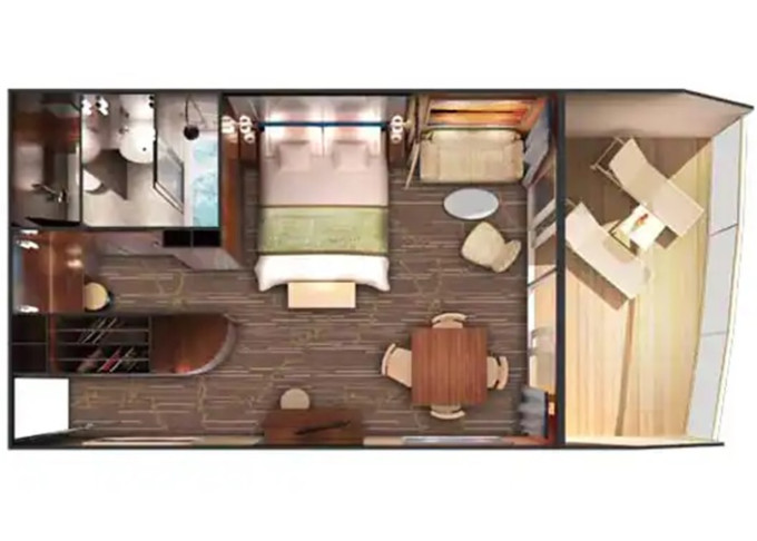 | S2 - Deluxe Owner Suite 54 m² / balkon 14 m². Výhody Suite. 10. paluba - vpředu. Max 4 osoby. | 308 072 Kč 154 036 Kč za osobu |