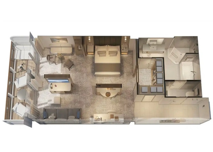 | CB - Cabana Minisuite 31 m² / 6 m² balkón a lounge. 10. paluba. Výhody Cabana. Výhody Mini-Suite. | 223 149 Kč 111 574 Kč za osobu | ||