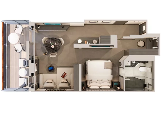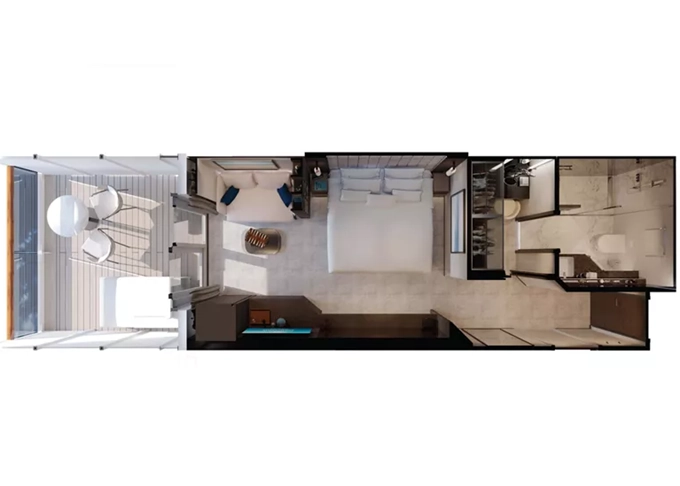 | Ocean Suites - Ocean Terrace Suite OT3 Suita 28 m² + terasa 7 m². 8,9. paluba - vepředu a vzadu. Maximální kapacita 2 dospělé osoby a 1 dítě do 17,99 let. | 183 085 Kč 91 543 Kč za osobu | ||