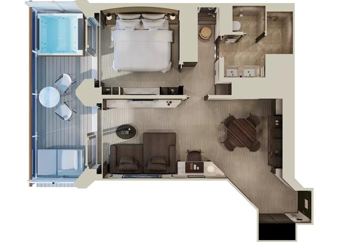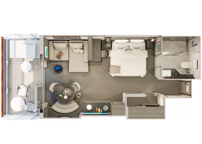 | Ocean Suites - Ocean Terrace Suite OT1 Suita 28 m² + terasa 7 m². 6. paluba střed / 7. paluba vepředu, vzadu. Maximální kapacita 2 dospělé osoby a 1 dítě do 17,99 let. | 174 343 Kč 87 171 Kč za osobu | ||
