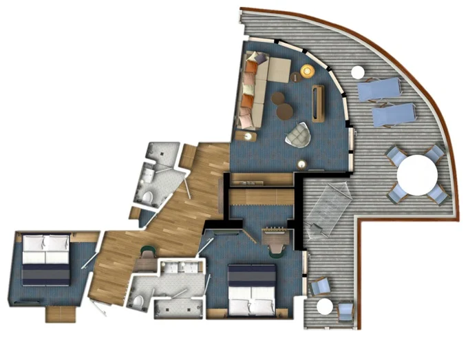 | SPNO - Panorama Suite 73-77 m² + balkon 31-36 m² se stolem, lehátky a houpací sítí. 2 ložnice a 2 koupelny. 6,9,10. paluba. Max 6 osoby. Výhody Suite. | 529 423 Kč 132 356 Kč za osobu |