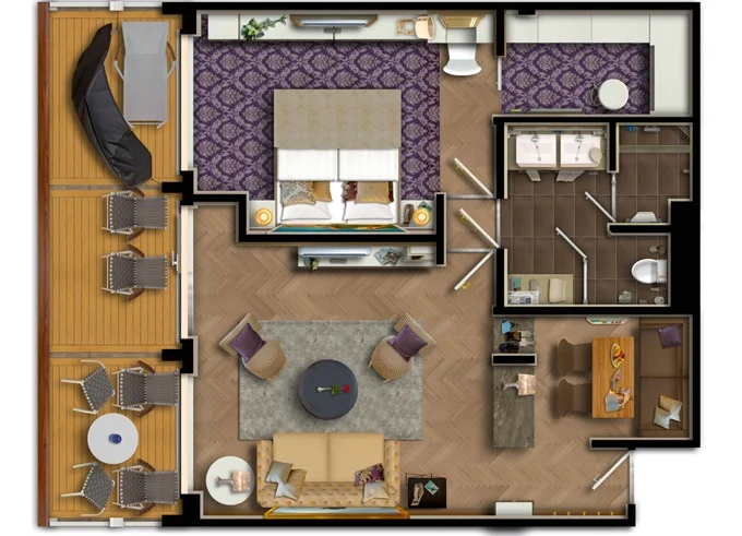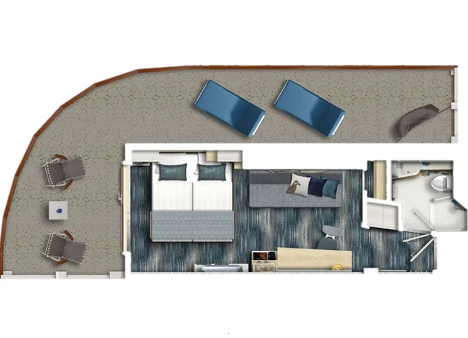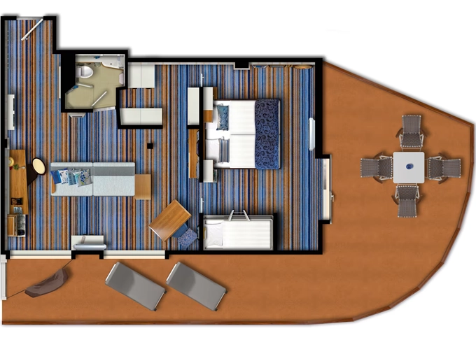 | SUTO - Themen Suite 54 m² + balkon 15 m² se stolem, lehátkom a houpací sítí. Ložnice, Obývací část, šatník. 10. paluba. Max 4 osoby. Výhody Suite. | 139 275 Kč 34 819 Kč za osobu | ||