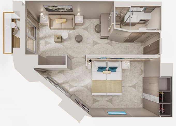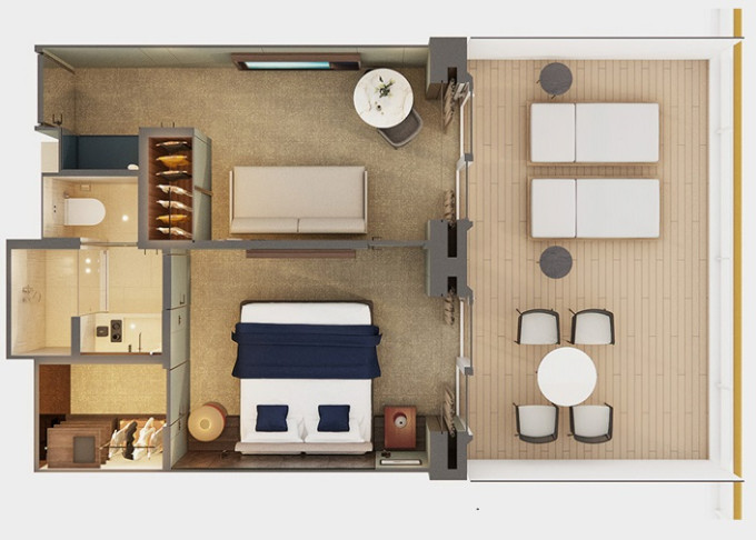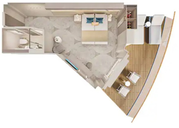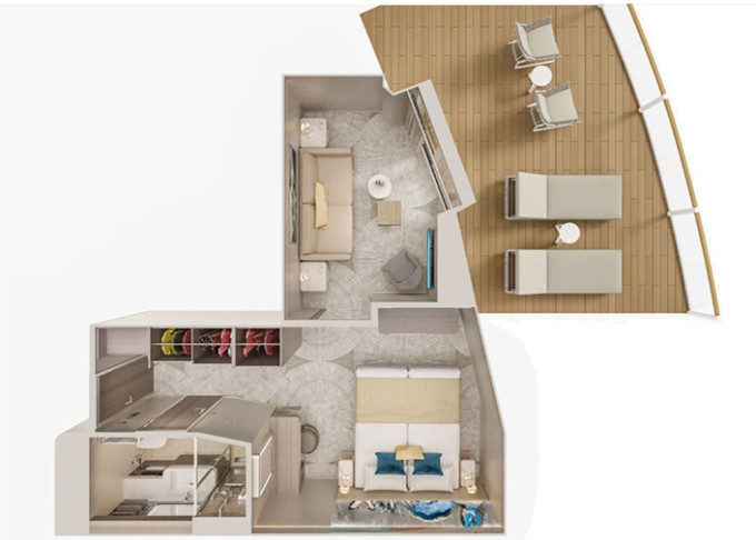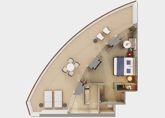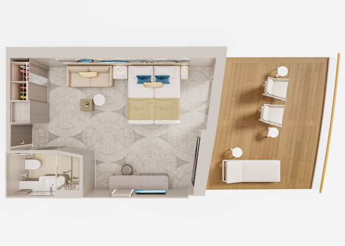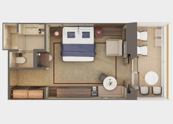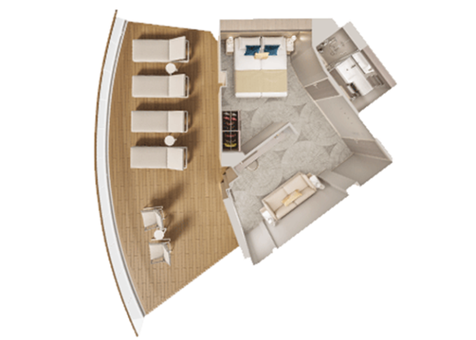 | SH - Suite s velkým balkónem Aft-Facing 59 m² / balkón 34 m². Výhody Suite. 9. paluba - vzadu. Max 4 osoby. | 240 983 Kč 120 491 Kč za osobu | ||